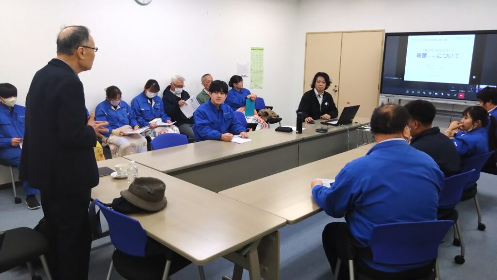 布目先生を講師に迎え、西条本社にて、今回は「殺菌」について講義をしていただきました。
